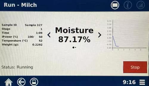 Für die Forschung und Produktentwicklung ist es häufig sehr wichtig, genaue Kenntnisse über den Trocknungsverlauf eines Stoffes zu bekommen. Dazu wird eine Probe im IR/Halogentrockner SMART Q auf die integrierte Waage gelegt und der Trocknungsvorgang wird mit der Einstrahlung von IR/Halogenstrahlung gestartet. Nun erfolgt die kontinuierliche Aufzeichnung des stetig abnehmenden Probengewichtes bis hin zur Gewichtskonstanz. Diese Daten werden sekündlich dargestellt. Dieser Trocknungsvorgang dauert typischerweise um die 5 min. und ermöglicht so schnelle Aussagen über das Trocknungsverhalten.